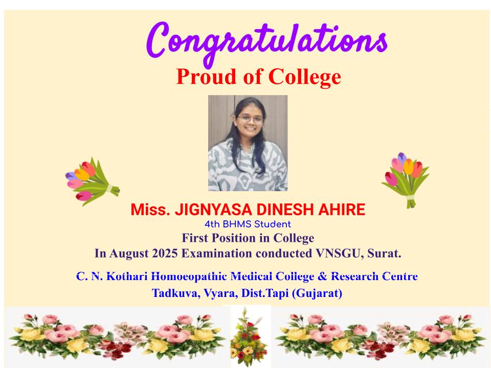 It's a proud moment for we all.....our college students Dr viral gamit from vyara got 1st rank and Dr Mehal shah got 8 th rank and our others students dr Urvashi...dr Hetal...dr Pooja...dr Chandradeep...dr shradhha...dr Shreya...dr harshna are selected in merit list of PG entrance exam(Gujarat) total 9 students of c.n.k.....on behalf of the C.N.kothari homeopathic medical college and research centre , vyara .... Heartily congratulate to all the students and best wishes for your bright future.....