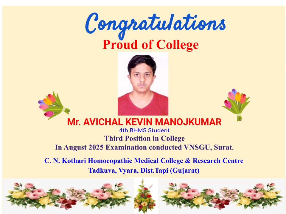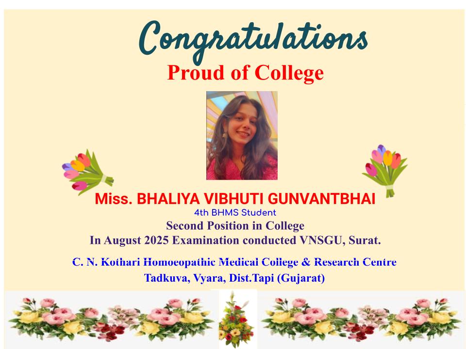 C.N.KOTHARI HOMEOPATHIC MEDICAL COLLEGE AND RESEARCH CENTRE,VYARA is proud of MISS PRIYANKA UPADHAYAY for winning first position in CLASSICAL VOCAL MUSIC AND LIGHT VOCAL MUSIC in YOUTH FESTIVAL ORGANISED BY VEER NARMAD SOUTH GUJARAT UNIVERSITY,SURAT.