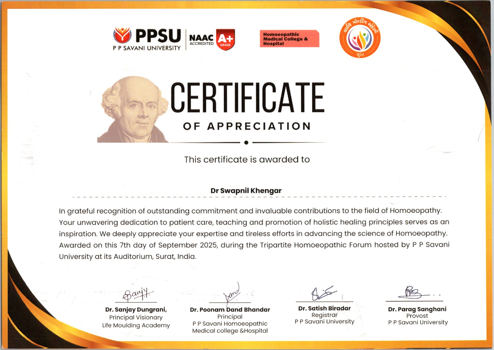 Many congratulations to Dr. Pankaj Lathiya, (Professor, Dept. of Community Medicine) for representing the college at SFIPET 2025 organized by Vidhyadeep University, Kim, Gujarat for successfully participating & presenting his research work entitled “Assessment and Homeopathic management of various types of viral warts with its individualise Homoeopathic medicine- An evidence based case series” under recent trends in homoeopathy at Sustainable future: Interdisciplinary perspective on education and technology 5.0 January 24, 2025.